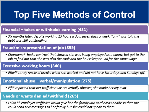 Outsiders often ask (whether externally or internally) a similar question for victims of labor trafficking—“why not leave?” The answer is the essence of the crime of trafficking. Traffickers use carefully honed and extremely effective methods of control to keep victims working and compliant. Traffickers may use more than one method of control for a victim; thus, these records are non-cumulative.