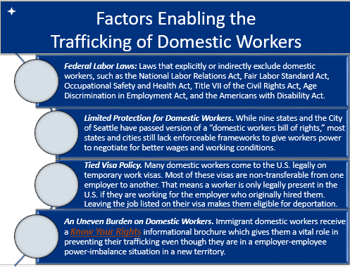 There are multiple factors that play a role in making domestic workers particularly vulnerable to certain kinds of employment abuse, exploitation, and labor trafficking. Domestic work, by its very definition, takes place in homes where traffickers can expect privacy. Domestic workers rarely have colleagues who share their day-to-day experiences and can corroborate reports of abuse. Nor are there code inspectors or similarly situated government officials who are responsible for ensuring the workplace is adhering to health, safety, and licensing regulations. Additionally, many domestic workers live in the houses of their employers. This creates an environment in which the worker may be isolated and have few opportunities to reach out for help. Key factors enabling the trafficking of domestic workers are listed below.