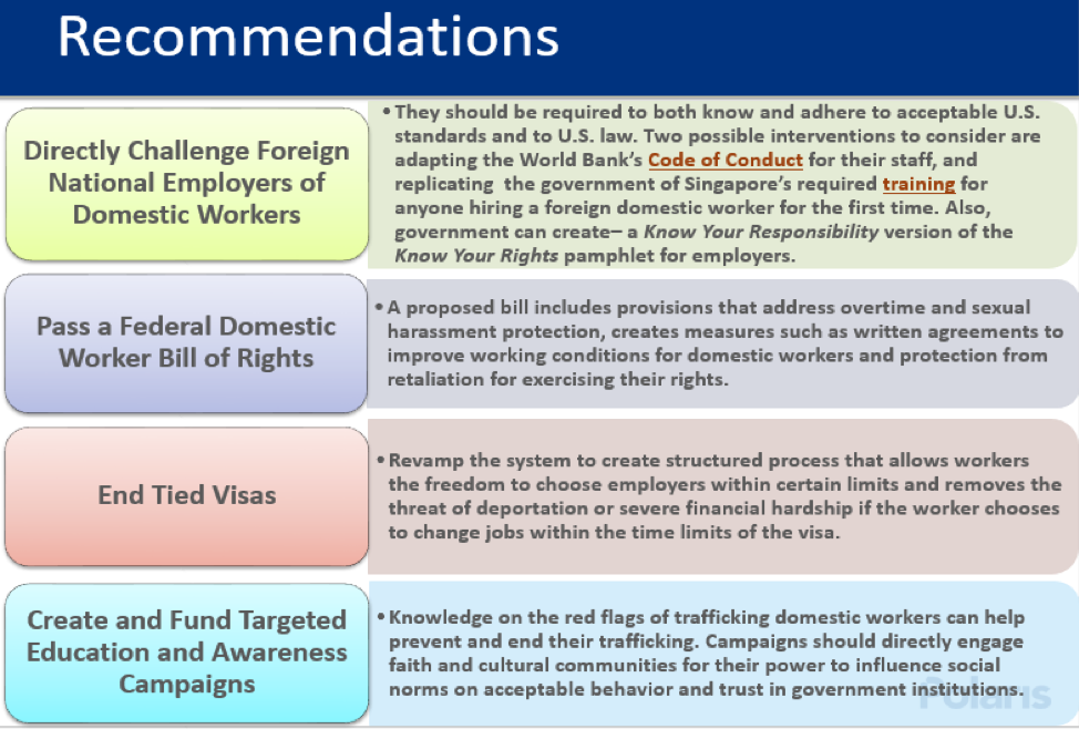As awareness of human trafficking has grown, mechanisms have slowly been put in place to prevent the crime, provide support to victims and survivors, and hold perpetrators accountable. Collectively, these efforts have helped countless people in domestic work. However, there is still a tremendous amount left to be done to protect the rights, freedoms, and livelihoods of the women and men who serve the needs of households around the nation. There are laws, policies, procedures, and regulations that, if enacted, could dramatically reduce the vulnerabilities of domestic workers and help ensure they are treated with dignity.