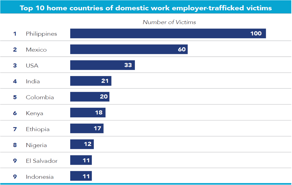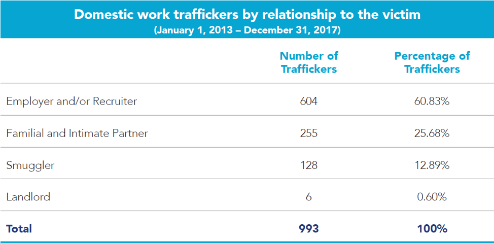 Disclaimers: This report does not feature all traffickers of domestic workers reported to the National Hotline. It focuses on trafficking that occurred within the traditionally defined employer/worker relationships as opposed to those with other types of relationships, such as trafficking for domestic work within familiar or romantic situations. While this kind of trafficking is important and deserves attention, the remedies which would effectively address this issue are different and outside of the scope of this document.