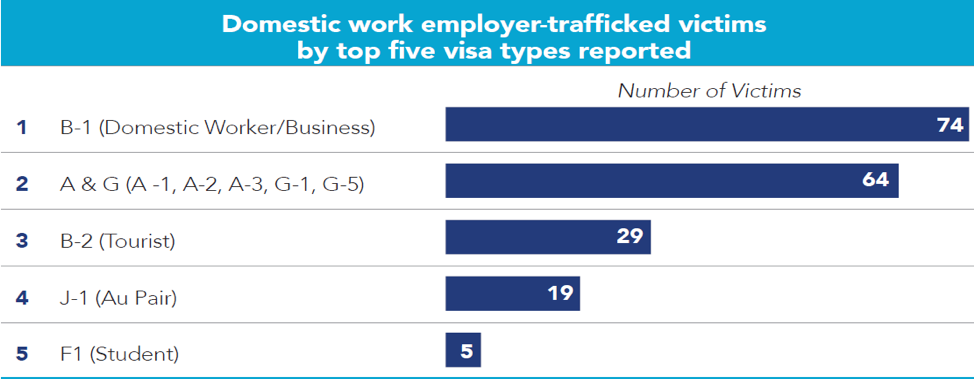 The domestic worker workforce, both globally and in the United States, is largely comprised of migrants. However, of victims of employer-traffickers who reported their immigration status, only 19% were undocumented. Meaning, 81% came to the United States legally under the auspices of non-immigrant visas. This, however, does not prevent them from becoming trafficking victims.