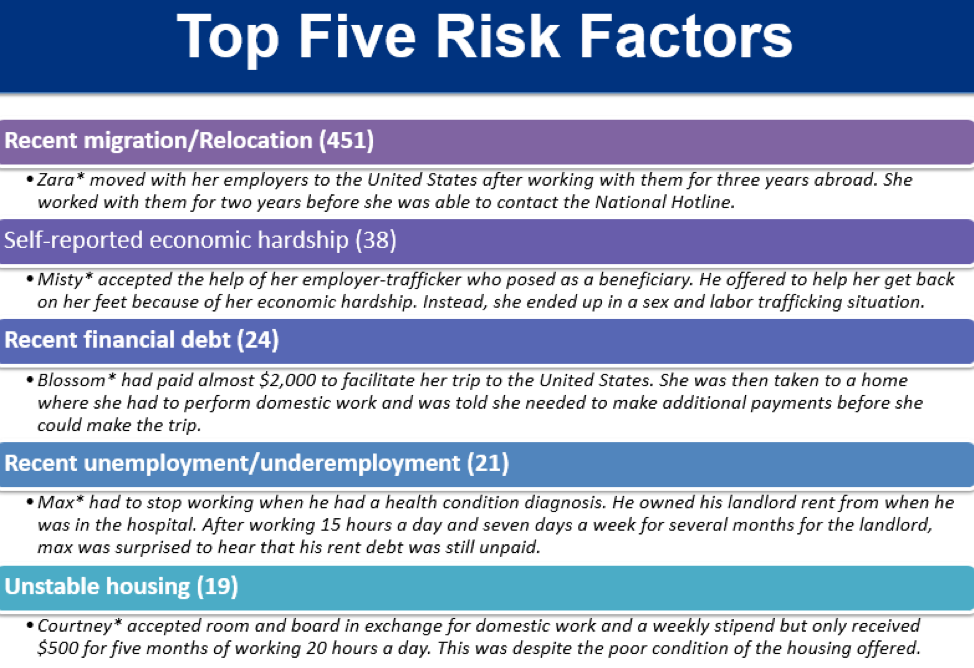 The National Hotline collects data on factors that make victims vulnerable to trafficking along with recruitment tactics used by traffickers to entice their victims. With this information, the government, corporations, non-profits, community members, and other stakeholders may develop strategic responses to reduce the vulnerabilities of victims and disrupt the recruitment practices of traffickers. Bear in mind, victims may have more than one risk factor, so these numbers are non-cumulative.