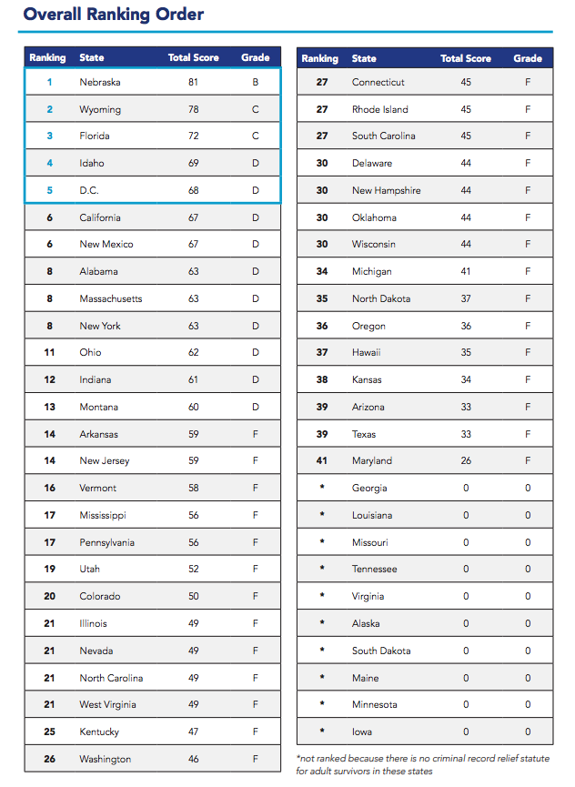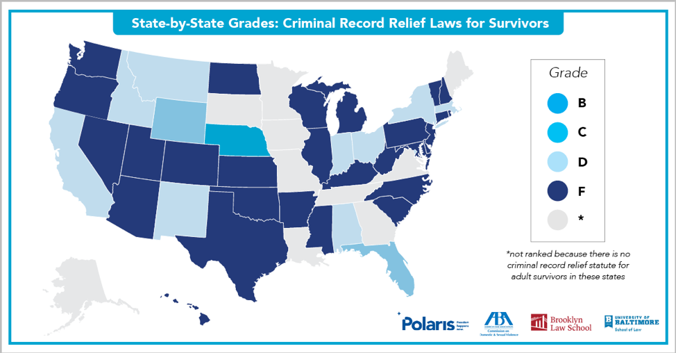 Twenty-eight states received an F, and only Nebraska received a B. No state earned an A. This indicates there is much progress to be made on criminal record relief statutes in every state, so the process of clearing records can become easier and less traumatic for trafficking survivors.
