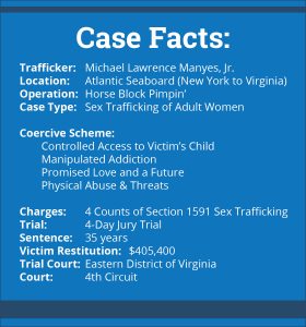 These characteristics made Lease an attractive target for Maynes—the ringleader of the Horse Block Pimpin’ sex trafficking conspiracy. Like with so many other women, Maynes made promises to Lease that he never intended on fulfilling. Over the year after their first encounter, Lease gave Maynes all her earnings. Though she left Virginia for work elsewhere, Lease found herself coming back to Maynes. Despite having to pay him to return, despite working to pay for his lawyer when he was in jail, she kept coming back. After all, she said, “[H]e took care of me . . . because I didn’t have nobody.”