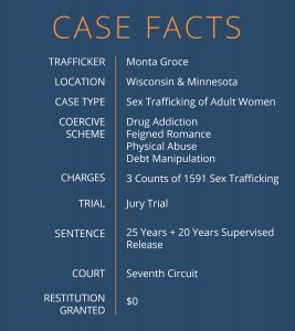 Groce stood trial in the Western District of Wisconsin on July 11, 2016. After a four-day trial and a 10-hour deliberation, the jury found Groce guilty of eight counts, including three counts of sex-trafficking. The jury found that Groce acted “knowing[ly] or in reckless disregard of the fact, that means of force, threats of force, fraud, coercion … or any combination of such means [would] be used to cause [a] person to engage in a commercial sex act” in violation of §1591(a).1 Groce was sentenced to serve twenty-five years in prison followed by twenty-years of supervised release.