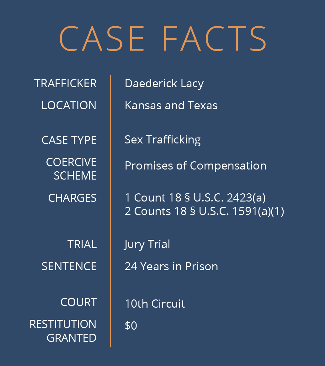 In search of a steady stream of income, Daederick Lacy recruited women and girls to work for him. Lacy’s business plan involved an illicit trade of sex for money. His ultimate reward? A jury verdict of 293 months in prison based on three felony counts of sex trafficking.