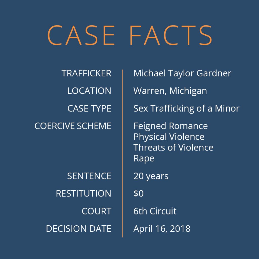 Gardner then fled to his mother’s house in Kentucky. B.H., who was pregnant at the time, went with Gardner, hoping to start over and not be forced to do more “dates.” However, within a week, Gardner pressured B.H. back into commercial sex and responded to her objections with increased violence. Exhausted, abused, and traumatized, B.H. fled Gardner’s mom’s house. Although she did not know where she was running to, she had clarity about who she was running from. A good Samaritan found B.H. as she walked alone along the Kentucky road and took her to authorities.