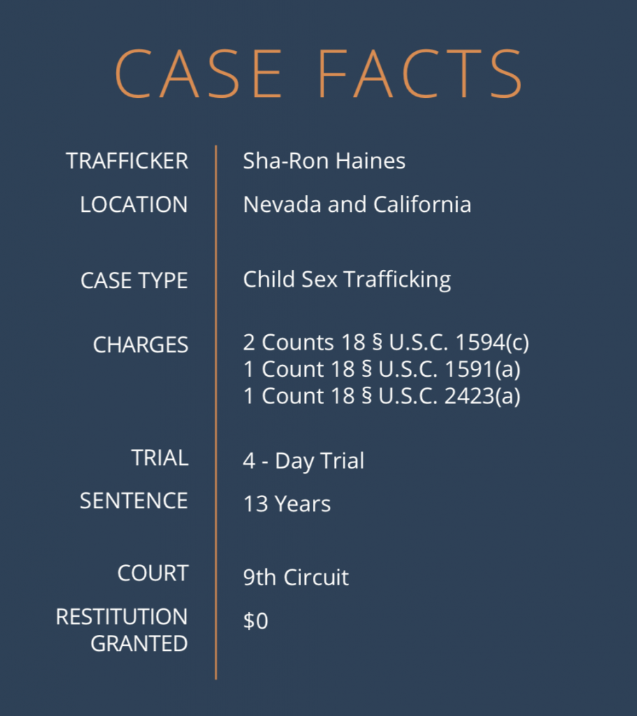 In 2014, the Project Safe Childhood Task Force of Nevada, a collaboration between federal and local law enforcement agencies, launched “Protect the Powerless,” an undercover operation focused on bringing “child pornographers, molesters, rapists, and sex traffickers to justice.”12 During the campaign, a Clark County probation officer reached out to Las Vegas Metropolitan Police with a tip. They had reason to believe a 15-year-old girl (later confirmed to be J.C.) was engaging in prostitution.13 Then, in September 2014, the Las Vegas Police Metro Police arrested the 15-year-old’s suspected trafficker — Sha-Ron Haines.