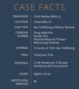 On June 8, 2017, at the end of a three-day trial, the jury found Betts guilty of all five charges. District Judge Stephanie M. Rose sentenced Betts to life imprisonment for each sex trafficking charge and 40 years for each of the distribution charges.
