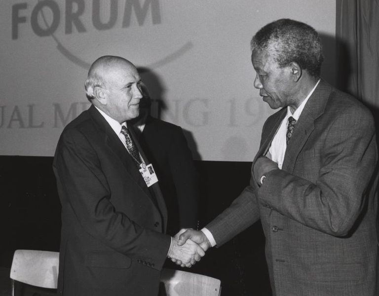 In 1993, F.W. de Klerk and Nelson Mandela were jointly awarded the Nobel Peace Prize “for their work for the peaceful termination of the apartheid regime, and for laying the foundations for a new democratic South Africa.” In 1994, South Africa held its first fully democratic election, and Nelson Mandela was elected as the first Black South African president. De Klerk joined Mandela’s government as second deputy president until resigning in 1996.