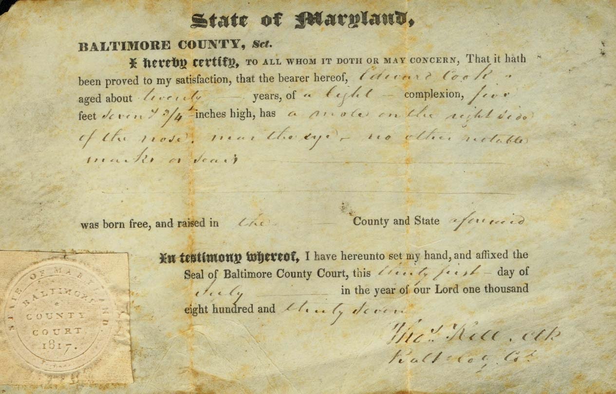 In 1838, Maryland required freed black people have “free papers” that documented their free status. The papers were extensive, describing in detail the person’s physical characteristics, and it was common that a slave would escape to the North by borrowing a freed person’s papers. This was dangerous because if someone caught the slave both him and the freed person would lose their freedom, but empathy and generosity compelled the freed. Unfortunately, Douglass didn’t fit any of the descriptions of his friends with free papers. However, this didn’t stop him from borrowing papers. While Douglass was much lighter skinned than the description of his friend, he borrowed his “sailor’s protection” papers, which although not free papers were sometimes accepted as much.