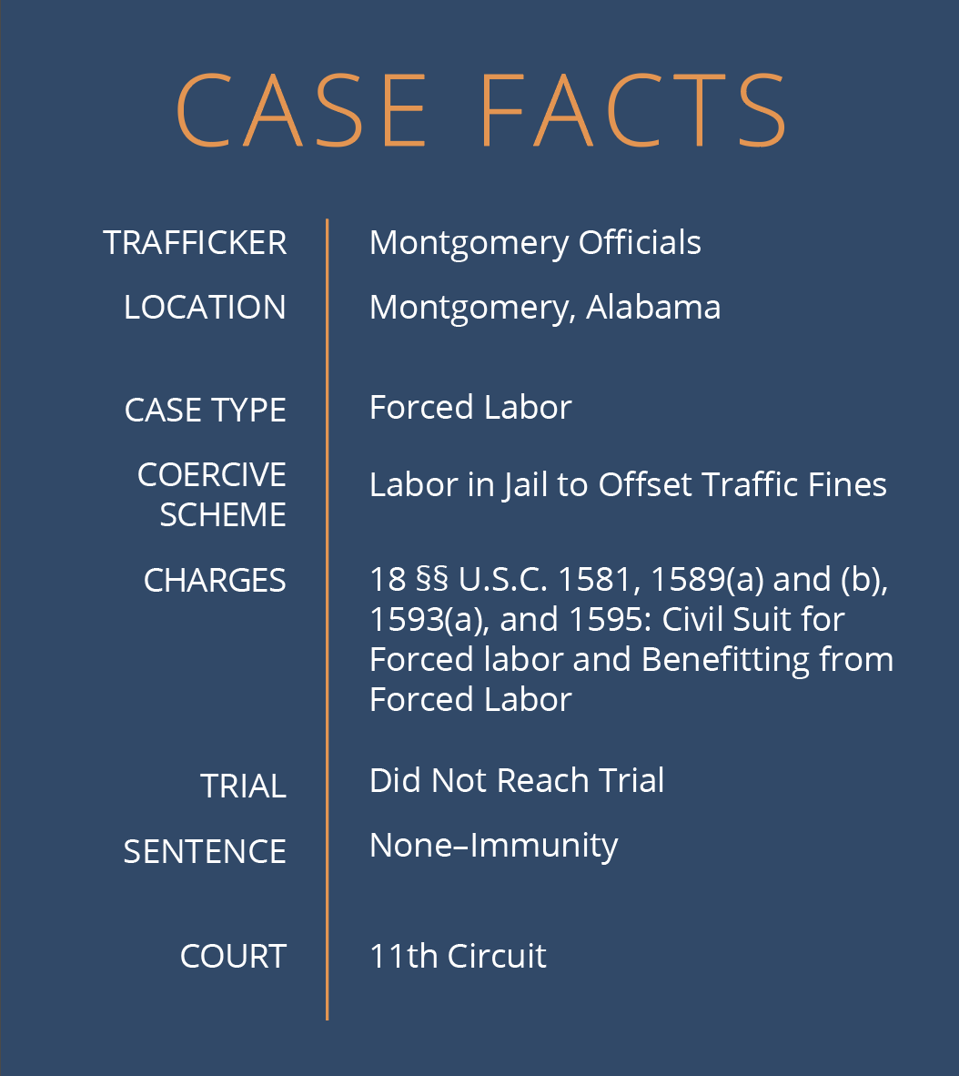 The defendants filed a motion to dismiss the case claiming the plaintiffs failed to state a claim for which relief could be granted. The District Court for the Middle District of Alabama dismissed some claims but refused to dismiss the claim of forced labor in jail. The City, two judges, the mayor, and two chiefs of police appealed, attempting to dismiss all of the claims. The 11th Circuit dismissed the City’s appeal but heard the individuals’ appeals.