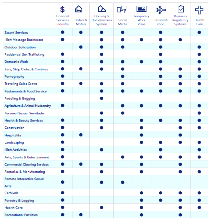Trafficking business models are not vacuums, they interact with legitimate systems and industries, and it is important to understand the business plans of human trafficking and how they work within and around these sectors. It is only then that it becomes more possible to prevent and disrupt human trafficking type-by-type. The information about how each of these systems and industries are exploited by traffickers comes from extensive surveys of, and focus groups with, survivors of all types of human trafficking, as well as data from the National Human Trafficking Hotline. Additional information as well as survivors’ thoughts and experiences with each of the industry sections can be found at: www.polarisproject.org/intersections.