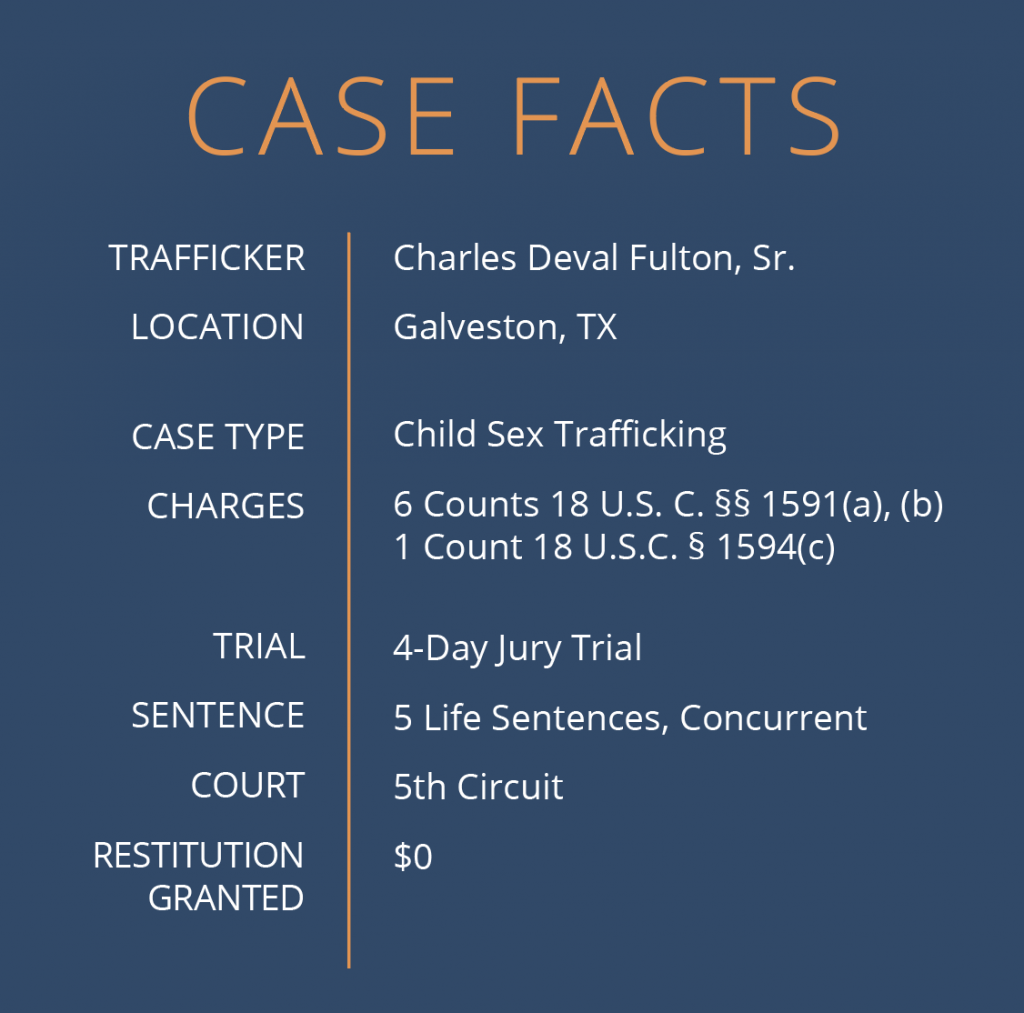 In May 2015, a grand jury indicted Fulton on two counts of sex trafficking and one count of conspiracy to commit sex trafficking in the Southern District of Texas. A year later, in May 2016, the government filed a superseding indictment, adding four counts of sex trafficking (with a different minor victim in each count) and one count of conspiracy.5 A jury found Fulton guilty of four of the six total sex trafficking counts as well as the conspiracy count. The district court sentenced him to concurrent life terms.