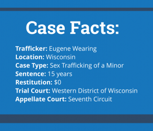 Eugene Wearing, a 55-year-old Wisconsin male, relied on the same tactics that many human traffickers use to manipulate a vulnerable teenage girl to engage in prostitution. In February of 2014, Wearing attended a basketball game at Superior Middle School in northern Wisconsin where he ran into KV, the 15-year-old daughter of a friend. Wearing knew that KV’s family was having financial problems and, as she was leaving the basketball game, he approached her with a business proposition: KV could earn some extra money for her family by providing sexual services to “dates” that Wearing would help to arrange.